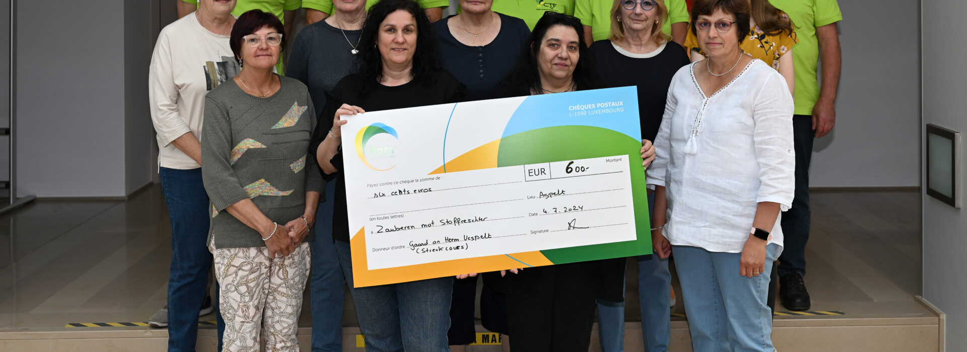 Als Ofschloss vum Stréckcours huet de Gaart & Heem Uespelt nach emol d’Aschreiwungsgeld un dës Associatioun weiderginn, déi ee grousse Besoin huet un Hëllef. Dës Vereenegung, gegrënnt 2018, huet sech jo zur Aufgab gemaach, mat gesammelte Stoffreschter Gezei ze bitzen fir Stärekanner, Frühchen oder och Puppelcher aus anonyme Gebuerten. Si hëllefen och d’Gebuertsstatioune vun de Maternitéen an der Clinique Dr. Bohler mat hirer faarweg-frouer Bettwäsch ze verschéineren, an de Famillen e besseren Openthalt ze gestalten. Den Eltere vu Stärekanner ginn si an dësen donkelen Zäiten ee besonneschen faarwege Moment mat op de Wee. Mee och wann si vill Stoff geschenkt kréien, brauchen di fläisseg Néieschen dach eng 12.000 €  bis 15.000 € pro Joer fir all aner Material ze kafen, wéi Knäpp, Zwier, Borden asw. All finanziell Ënnerstëtzung ass bei hinnen häerzlech wëllkomm. Et kann een neierdéngs och gebitzte Kaddoen fir Kanner a Puppelcher fannen op hirem Internetsite, géint eng fräiwëlleg Finanzsprëtz. Si kënne gäre kontaktéiert ginn iwwert zauberematstoffreschter@email.lu. Eis Monitrice Pascale Wallenborn-Genson huet gären op hir Entschiedegung verzicht, fir dës wäertvoll Aarbecht ze ënnerstëtzen. Merci Pascale!