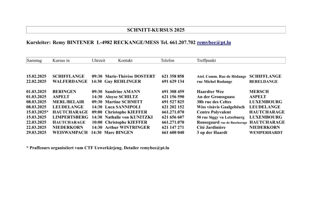 Hei fannt Dir d’Datumer vun de Schnëttkuren déi d’Ligue an Zesummenaarbecht mat de Sektiounen an dem Här Bintener organiséiert