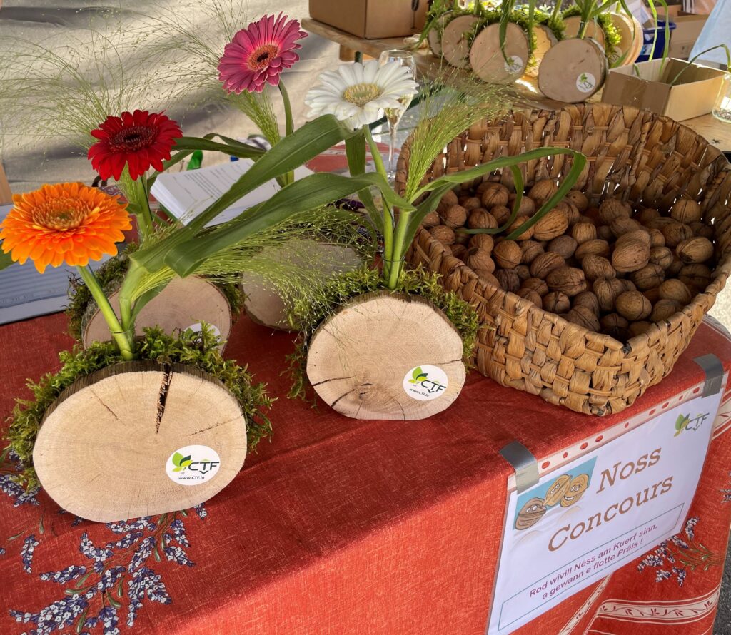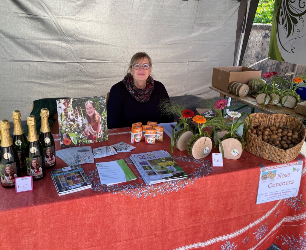 Bei sonnegem Wieder huet d’ Regional Osten mat engem Stand op dem Blummemaart zu Ouljen den 14.5.2023 deelgeholl. Niewent den selwer gemaachen Blummenarrangementer, dem Schampes vun der Blumme Kinnigin, konnten Leit um Nëss Concours deelhuelen. Vill Leit hunn mat geroden an 5 vun hinnen kruten een Präis well Sie am noosten drun waren. Insgesamt waren 285 Nëss am Kuerf