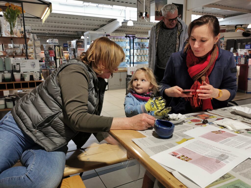 Pendant toute la journée les enfants de tout âge ont eu l’occasion de fabriquer des bombes de graines. Avec beaucoup de joie et d‘endurance de petites et grandes bombes ont été fabriquées de terre, de terre glaise, d’eau et de semences de fleurs, elles furent amenées à la maison avec grande fierté et serviront à l’embellissement des alentours.