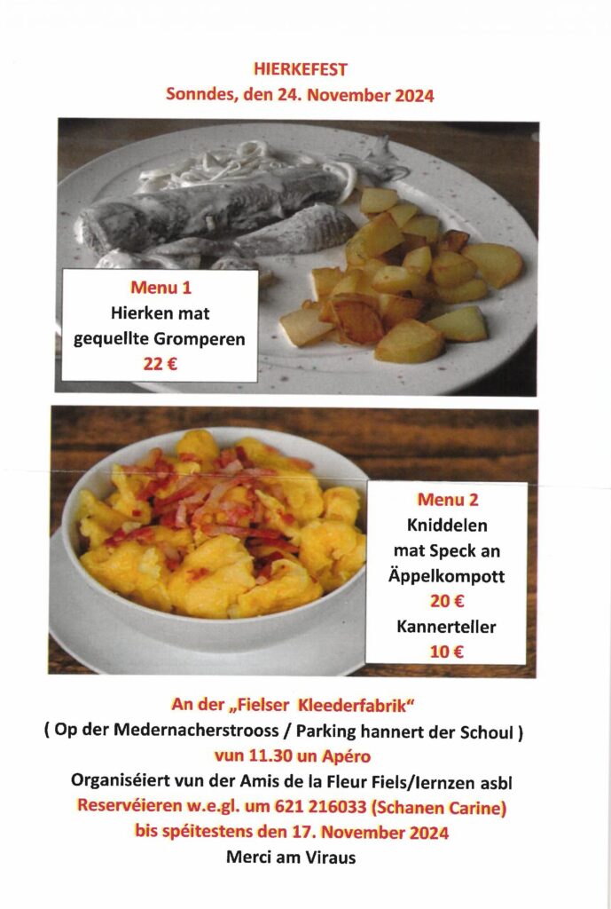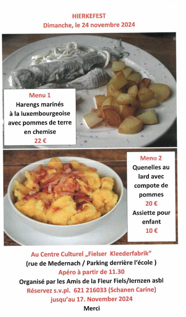 La section Amis de la Fleur Fiels/Iernzen vous invite à sa fête du hareng qui aura lieu le 24.11.24 à 11h30 à la « Fielser Kleederfabrik » .
