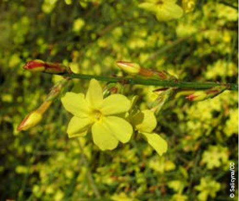 Jasminum nudiflorum. Parmi les exemples les plus courants, nous trouvons le Jasmin d’hiver (Jasminum nudiflorum). Ce buisson se démarque par ses fleurs jaunes, en forme de trompette et par ses brindilles fines et flexibles. Il peut être cultivé en pots ou dans le jardin. Il ne faut pas le confondre avec le Jasminum polyanthum, le Jasmin blanc d’hiver, qui fleurit à la fin de l’hiver, ayant un parfum plus intense.